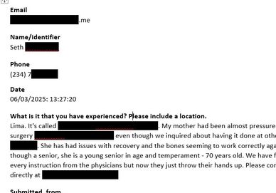 The first report submitted to Watchdog was received on June 3, 2025, concerning a Lima, Ohio area facility. The report was submitted by a family member trying to find action for a patient's post-surgical condition. Above is a screenshot of the actual incoming message as it came into the email responder box. Contact details have been redacted for privacy and for our ability to investigate the concerns identified in the submission.